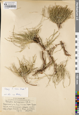 Н.И.И. Ботаники МГУ. А.И. Шретер. Растения Центральной Тувы 1946 г. Ephedra monosperma C.A.M. Эрзинский р-н, 2 км. ССЗ. пос. Сарыг-Булуна. Скалы Ю.В. экспозиции севернее моста через р. Эрзин. Вместе со Stipa orientalis. 1/VII 47. А. Шретер